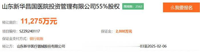 近日,山东产权交易中心发布一则消息,新华医疗挂牌转让旗下控股的山东新华昌国医院投资管理有限公司55%股权,转让底价约1.13亿元。